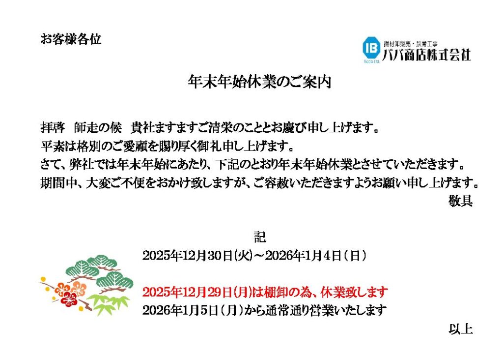 2025年12月29日(月)は棚卸の為、休業致します 2026年1月5日(月)から通常通り営業いたします 以上